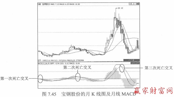 如果要进场,在周线MACD中出现黄金交叉时少量参与,在第二次出现死亡交叉时,卖出所有股票。因为这时周线MACK出现顶背离,即股价上升,而MACD出现下降,并且均线开始发散;K线出现穿头破脚。如果月线MACD出现死亡交义,则该股票将长期看空、做空,一年之内不要再对它抱有多大希望。宝钢股份(600019)的月K线图及月线MACD如图3所示。