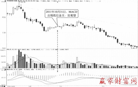 2011年10月31日,随看股价的逐步回升,中纺投资(600061)的MACD指标出现了低位金叉。但自11月中旬开始,股价就又开始延续前期的下跌趋势,并不断地再创新低。如下图所示。