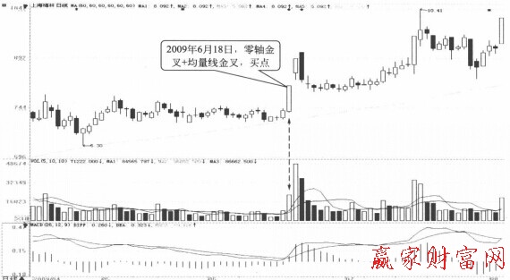 这是因为,零轴附近的金叉,往往出现在一段先上涨、再回调的走势之后。此时的金叉,预示着调整行情已经结束,新一轮上涨行情已经开始。此时如果还伴随着均量线的金叉,就说明股价的上涨得到成交量的支持,买入信号将更加可靠。