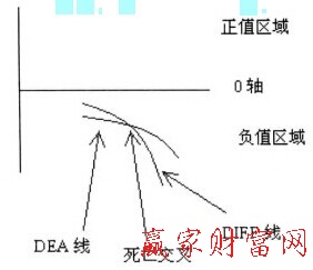 MACD调头向下也可以发生在负值区域,即在0轴下方运行。出现MACD调整向下,表示反弹结束,这时投资者要果断抛空,如图所示。