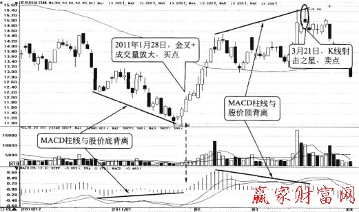 如图所示,2011年1月,东风科技(600081)在MACD指标出现MACD柱线与股价底背离的态势,而1月28日形成金叉,同时成交量逐渐放大。这表明一波上涨走势即将形成,投资者可以果断买入,之后股价一路上涨,2011年3月21日,该股出现K线射击之星形态的卖出信号,而此前一段时间的MACD柱线与股价出现顶背离,投资者要注意把握这个波段卖点。