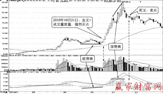 如图所示,2010年10月21日,太原刚玉(000795)的MACD指标现“MACD柱线与股价底背离+金叉”的买入信号,同时成交量也突然放出巨量,均量线指标出现金叉,投资者可以果断买入。