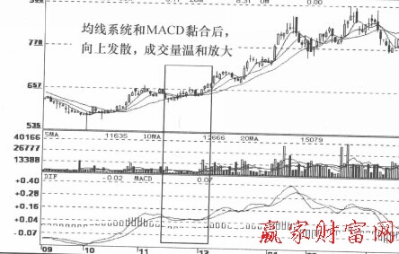 在日K线中,DIF线和MACD线穿过0轴后,由于庄家洗盘所致,DIF线和MACD线在0轴附近形成黏合状态,不久DIF线向上发散,SAR红柱产生并逐日增长,构成买入信号。移动平均线也形成黏合状态,总体趋势向上,均线坚挺有力。随后向上发散,形成多头排列,成交量温和放大,买入信号清晰可见。此后,股价出现盘升走势,行情延续一年多,累计涨幅巨大。