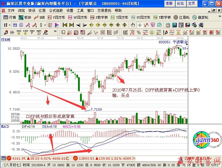 如图所示,2010年7月26日,宁波联合(600051)的DIFF找出现DIFF线向上突破0轴的买入信号。在这个买点发出之前,2010年5月中旬到7月初,该股MACD指标已经出现了DIFF线与股价底背离的看涨信号。这两个买点叠加在一起,走势出现上涨趋势的概率大大增加。之后该股股价出现了一波较大的上涨趁势。