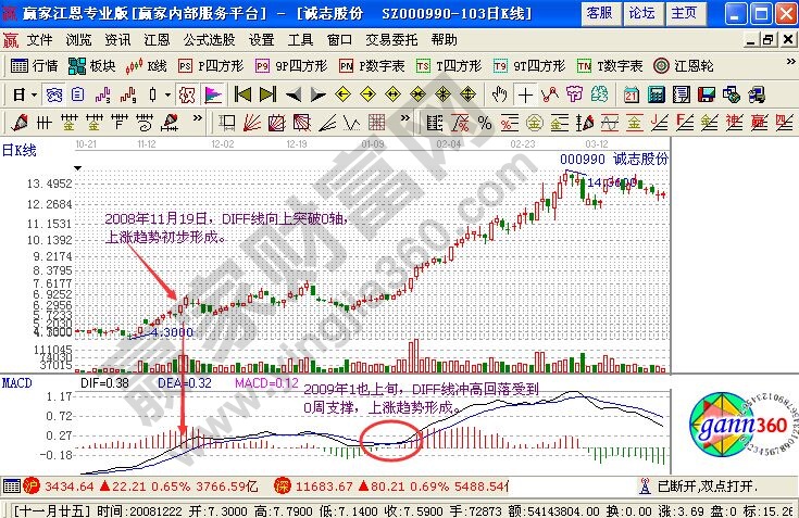 如图所示,2008年11月19日,诚志股份(000990)的DIFF线向上突破0轴,表明市场已经初步地由下跌趁势转为上涨趋势。2009年1月上旬,DIFF线冲高回落之后得到0轴的支称再次向上,表明市场上涨趋势已经彻底形成。之后,该股股价出现了一波较大的涨幅。