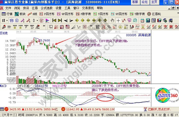 如图所示,2008年5月30日,滨海能源(000695)的DIFF线向下跌破0轴,表明市场下跌趋势已经初步形成。之后,股价出现了一个快速下跌的过程。7月下旬,DIFF线经过向上反弹确认,下跌趋势彻底形成。