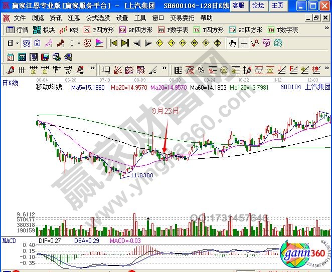 图1为上汽集团(600104) 2013年8月23日分时图,如图标注所示,个股在早盘一直呈现弱势运行格局,MACD指标线也一直运行于0轴下方,这是空方力量占据优势的标志。但在午盘开盘之后,MACD指标线跃升至0轴上方,此时的股价分时线却并没有同步跃升至均价线上方,这说明指标线的0轴逆转并不可靠,不可将其视作个股由弱转强的信号。(文章来自赢家财富网http://www.yingjia360.com)