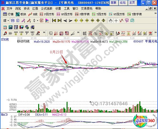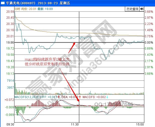 图3为亨通光电(600487)2013年8月23日分时图,如图标注所示;同样,此股的MACD指标线出现了0轴逆转,但分时线没有出现,这是一种虚假的强弱转换信号,一般来说。个股随后再度步入弱势运行格局的概率较大,它非但不是上涨信号,反而可视作股价极有可能再度下跌的风险信号。