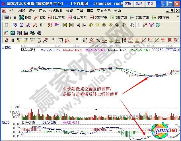 图3为中百集团(000759)2013年1月至8月走势图,如图标注所示,在经历了深幅下跌之后,个股的26日均线MA26仍在震荡中有所下移,但此时的MACD指标却开始逆转向上,这就是均线、指标线的低位背离,它预示着中期底部的出现,是买股布局时机。