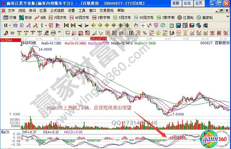 如图该股在2012年4月到2013年5月的走势变化,MACD指标线一直运行在0轴的下方,是跌势继续的标志,之后一波上涨的走势幅度比较大,(版权归赢家财富网所有,严禁非法转载,转载请注明出处,www.yingjia360.com)使得macd指标线向上突破了0轴,当macd突破0轴距离较远的时候,股价有所回落的倾向,这个时候应该先短线卖出观望。
