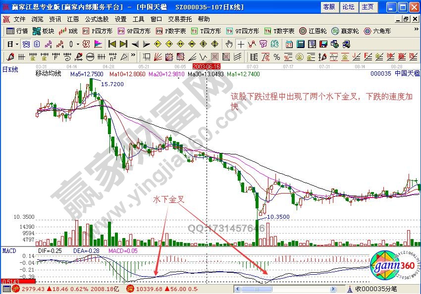 如图该股在2003年6月到11月的走势变化,在下跌过程中出现了两个水下金叉,但是出现了三个水下金叉,股价下跌的速度逐渐加快了,如果在第一次出现死叉的时候,没有卖出的话,可以在第二次出现死叉的时候卖出股票,以免后市出现套牢的情况。
