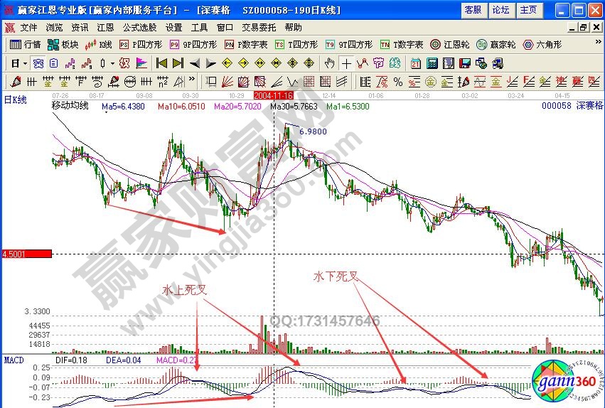 水下死叉是指macd指标在零轴以下形成的死叉形态,零轴下方是绿色的量柱,水下的每一次死亡交叉都对应着一次快速的下跌,红色的量柱形成的死亡交叉一般只是一次回档,回档完毕可能还有反弹,但是在零轴下方的时候,水下死亡交叉下跌速度快,空间大,时间长,而且水下的黄金交叉也不灵,买进后几乎没有什么机会,如果见到d/e两条线所示,黄金交叉进去,死叉交叉出来还是要亏钱。