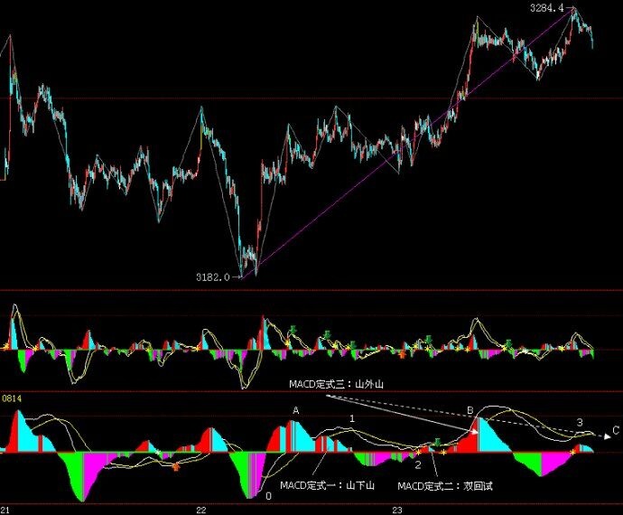 图中还能判断站在MACD山上山走势形成的A峰之后,可以确定是能够望到其后的走势必定有B峰,当然B峰有高低区别,对应MACD定式一中第五段走势创不创新高的两种分类。可以排除的是2处和3处的小山包与A峰和B峰不是同级别的。
