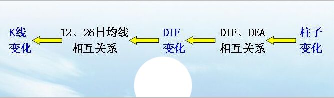 DIF一旦开始变大,因为稳定,DIF还将继续变大,说明12、26日均线的距离差将继续变大,呈稳定的发散状态。因为长期26日均线比较稳定,仍会继续向上,为了保证稳定的发散状态,短期12日均线只能加速向上,即K线上涨。其实,就是指标与K线的同步关系:K线上涨,指标DIF上涨。