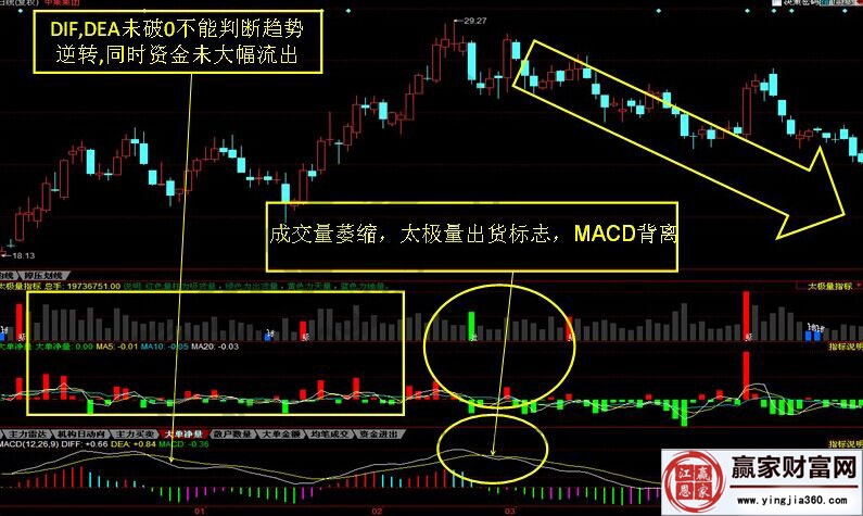 从上图我们可以看出,它又不同于第一张图,此时的macd在第一次死叉的时候,两条线并未向下破0轴,当然此时也是一个建仓的信号,而且资金流入是非常明显的,同时成交量也是有效的放大,这就说明了整体大资金并没有外逃,它并不能判断趋势,所以应当做好建仓的准备,到后面的一个警察的时候,成交量萎缩了,自救流入的幅度也江少恩多,所以它是一种虚浪的拉升,此时就要进行注意了,在下个死叉的时候,就需要进行清仓。