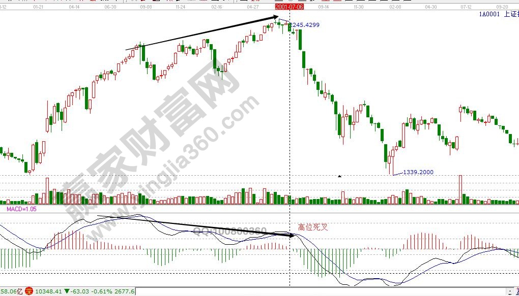 下图是2001年7月份大盘的周线,macd高位死叉后,进入阶段性的调整: