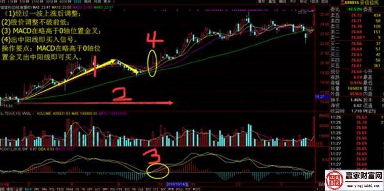 显然上面的分析中是完全运用了macd抓趋势的战法。当然它的条件就是:股价在经过一波上涨之后出现调整,股价调整病不破前面低点,macd是在0轴位置附近上方出现金叉,K线上出现中阳线就是买入信号,此战法的操作要点就是:MACD在略高于0轴位置金叉出中阳线即可买入。