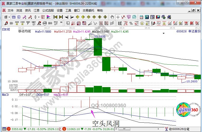 空头风洞战法是怎么样的?它其实是macd两条线所形成的,与多头风洞是正好相反的,它具体的走势是怎么样的?我们首先来看下面的申达股份走势图。