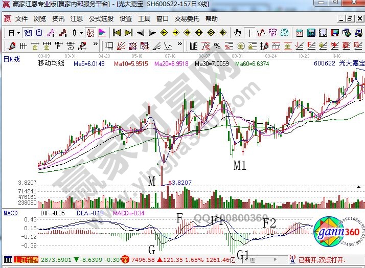 从macd峰谷交替出现来看,在macd柱状线股出现以后,柱状线峰形态出现在F和F1位置,同时股价开始强势反弹,柱状线峰继续转变为柱状线谷,图中G1位置的柱状线谷出现,股价同步下跌至M1位置低点。