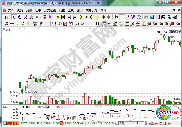 上图是圆通快递历史上的部分走势图,从图中我们可以看到,图中所圈住的地方,macd柱线一直都在零轴上方徘徊,而且柱线是比较短的,显然是符合上面的零轴上方徘徊形态的,而且在这段时间内,DIFF线贴近DEA线一直都在零轴上方运行,这就表明了市场一直是处于上涨趋势中,投资者此时就要注意持股待涨了。