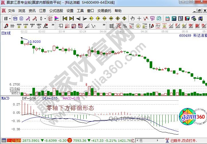 上面是科达洁能历史上的部分走势图,从图中我们可以看到,圆圈所圈的地方形成了典型的零轴下方徘徊形态,而且这段时间DIFF线和DEA线一直都在零轴下方运行,表明了市场整体上仍处于下跌趋势中,此时投资者就要注意持币观望了。如果是DIFF线和DEA线一直在零轴上方运行,那么就表明了市场整体上仍处于上涨趋势中,出现零轴下方徘徊形态,只是上涨过程中的回调,所以投资者仍可按照原有走势来进行操作。