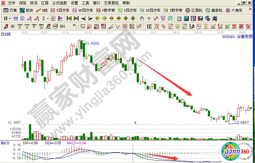 实例图解如图:合康变频(300048),其dif线和dea线一直在0轴下方运行,并且在随着股价的中心在不断的向下移动,说明了股价下跌的趋势并没有发生改变,这个时候投资者应该及时的卖出该股票。
