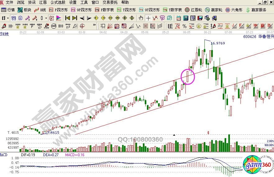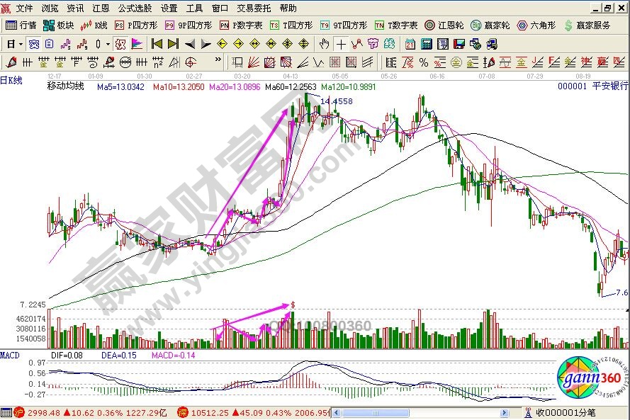 我们在第二张图的时候,配合均线来看,个股在突破上升通道的时候,同时我们看到股价加速上升同时也是偏离13日均线,显然也是卖点的出现,如下图所示。