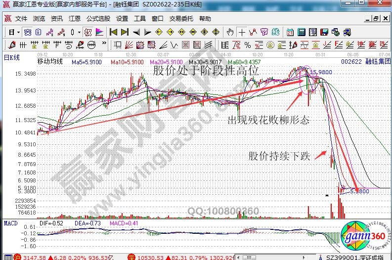 在该形态出现之后,多头并没有就此罢休,而是展开了相应的反击,但是反弹的高度始终是没有越过残花败柳线的开盘价,所以最终该形态成立得到了确认,在之后股价就大幅的下滑,在11个交易日内跌幅将近50%。所以该形态是一种强烈的看跌信号,一旦手中个股出现了该形态,那么投资者就应该做好卖出的准备。
