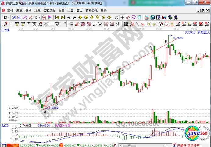 上面是东旭蓝天在12年年初到12年5月份的走势图,从图中我们可以看到:股价从A点反转向上,可以画出一条上升趋势线。在上升趋势线没被破坏之前,可以持续做多,此后该股在C处长阴线跌破上升趋势线,原有的上升趋势线已经是被破坏了,所以需要重新确定。