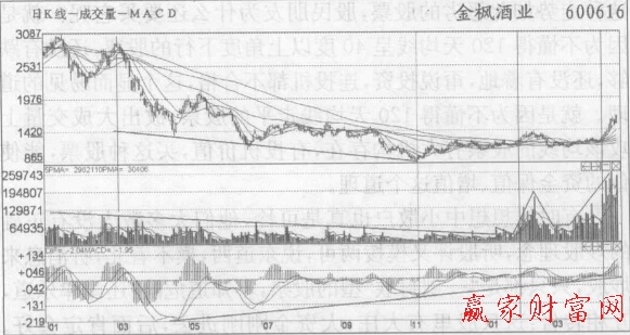 在图中第四条竖线处,长期均线走平了,MACD又在0轴线上方产生了金叉,成交量产生了金叉,出现“一平、三金叉”的形态后,可以考虑买入。在第四条竖线后面,出现了此股上市以来的天量,大机构是下定决心要做多此股了,由于此股在短期内涨幅过大,必有回调在后头,大机构如果要做多,股民自己不想出来也要把他们吓出,估计此股后市将有大的调整。等到第二浪调整结束,第三上涨浪开始之时,此股涨得将会很高。炒股要有耐心,也要有定力,看到成交量连续放得很大,图中最后成交量产生了死叉,MACD白线已经不再上行,此股出现调整是必然的,等到调整完毕,MACD再次在。轴线上方产生金叉,股价向上突破压力线之时,就是我们买人与机构一起做多的时候。这个时机还没有到,但等到股民朋友看到这本书时,可能买入的时机已经错过了。