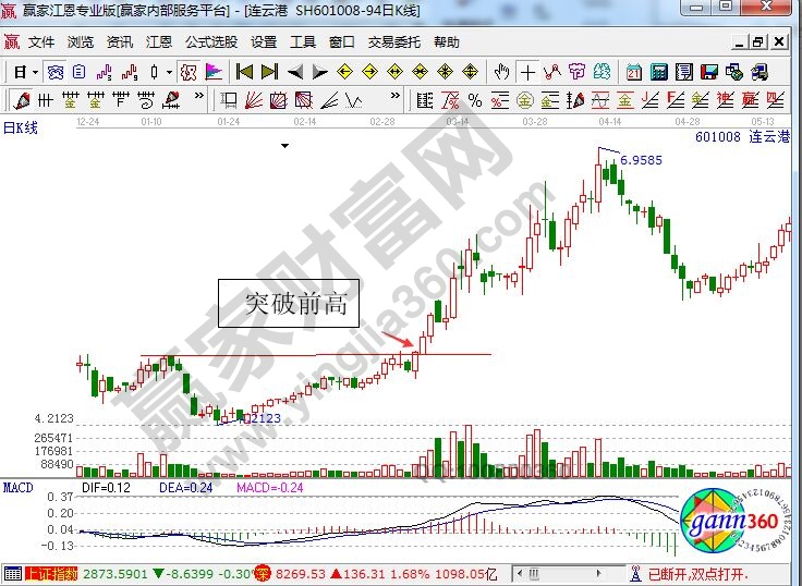 突破前高日买入法是怎么样的?在具体的K线走势中,就是当股价已经突破低位区域,并且在低位由下降趋势转为上升趋势,超过了上期下降行情中K线反弹的波峰高点时,形成了突破前高的走势,这种形态的走势就是可靠的做多信号。