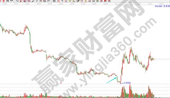 2. 在下跌行情临近尾声的时候出现大阴线,结合成交量,大阴线也没有大的成交量放出,一般表示做空能量已经释放的差不多了,加速的大阴线更像是最后的洗盘,把扛不住的套牢盘洗出,在这个阶段,卖出就上当了,交易上逢低买入为主。这也是市场“物极必反”的原理。