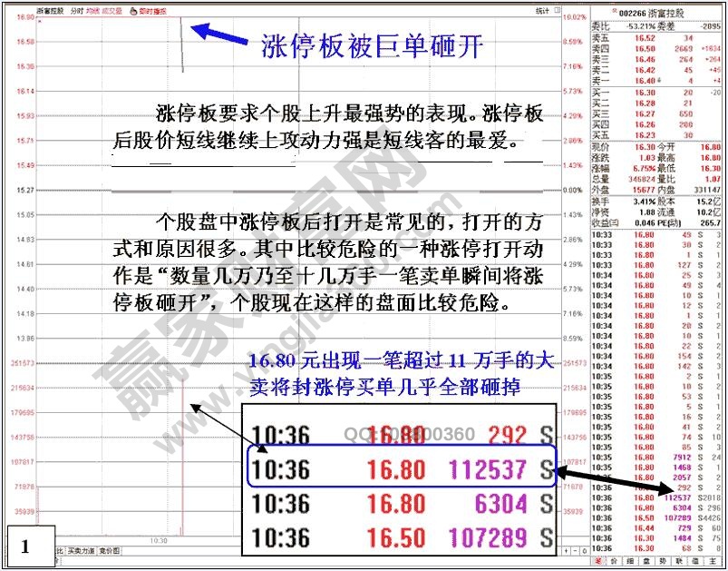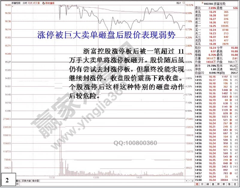 观察该股的分时图(如上图)可以看出,涨停板被巨单砸开。涨停板后股价短线继续上功,是短线投资者的最爱。但不管是短线投资者还是中线投资者,都要避免涨停板个股机构大幅砸盘出货的个股。从该分时图中可以看出该股涨停板被打开是由于11万手的大卖单砸开的,投资者在此时操作是非常危险的。