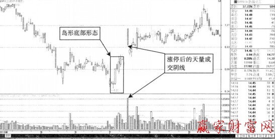 如图所示,氯碱化工持续回落过程中,见底回升的岛形底部早已经形成了。相应的成交量,也出现比较明显的放大。而股价跳空拉升的一字涨停板完成后的第二天,股价出现了天最大阴线的K线形态。这样看来,后期股价的放量冲高还是非常值得期待的。天量出现的背后是该股岛形反转后的持续看好的行情。