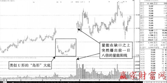 如图所示,中珠控股的走势中,底部岛形反转的形态更像是圆弧形反转走势。而图中所示的跳空拉升缺口的完成,股价快速暴涨的背后,是放量八倍阳线的出现。该股持续走强的开始就在该股放量阳线出现之时。