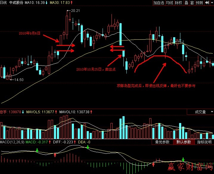 如图所示,2010年9~10月,中成股份(000151)的日K线图上出现了顶部岛形形态。