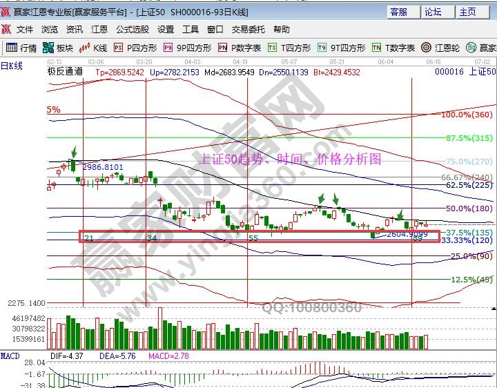 谈一下跟踪的几个指数,上证50日线底背离、日K线围绕趋势线生命线上下震荡,这个积极的信号我在11号的文章中谈到过。赢家江恩系统的买卖决策都需要满足趋势、时间、价格三方面共振,周线的时间窗是7月的第一周,趋势参考极反通道日、周生命线,当趋势和时间结合时,价格空间方面就是寻找入场点。最后谈一下短线,今日收盘15、60分钟收盘在趋势线生命线2663上方附近,明天继续关注此线得失。