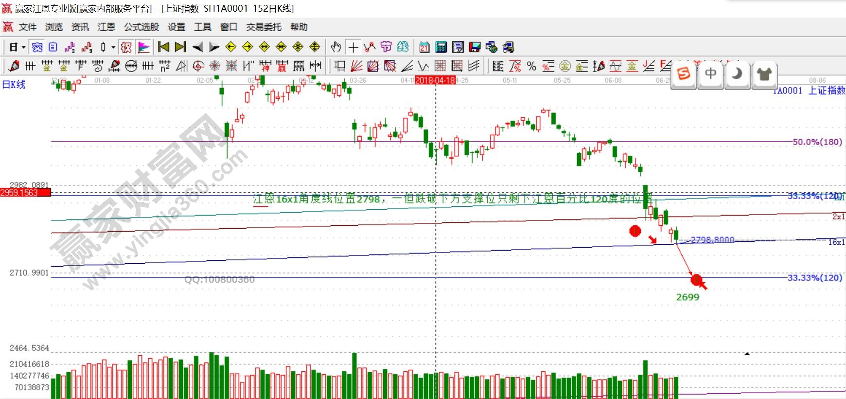 以上四张图分别是上证50、创业板指、沪深300、上证指数的月线级别极反通道走势图,从图形上可以看出,月K线跌至生命线或蓝色下轨线,严格按工具规则,市场持续大幅杀跌的概率不大,纯技术性低点已不远了,但市场投资的情绪是无法掌。维持6月底或7月上旬市场出现阶段底部的观点不变,本周是周线时间窗,快速下跌产生的低点有参考意义,未来走反弹或横盘的概率较高,将通过赢家江恩系统工具继续跟踪解读。