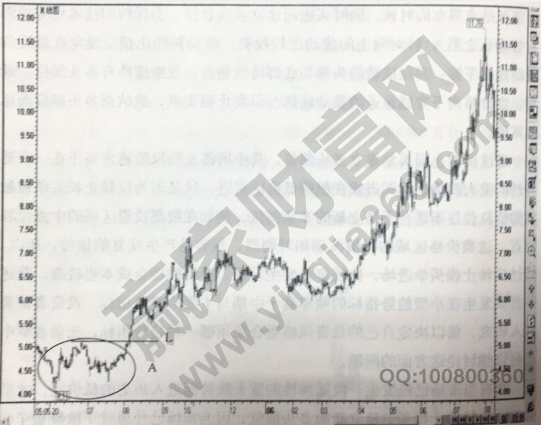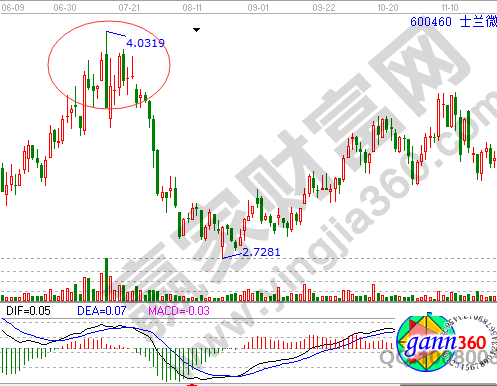 以G士兰微(600460) 为例,如图所示。该股2006年7月12日的高位是10.78元,第二个交易日出现向上空转的形态,最高摸到11.10元,波动头部被穿越了0.32元,但这并没有造成趋势向上反转,随后又恢复下降趋势。换言之,如果我们把止损买单设定在波动头部的上侧的0.30元,当止损单被触发时,趋势随后并没有走高,如图圆形所示。