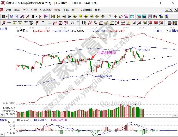 技术指标很多,破位后含义不同。比如MACD指标属于中线指标,一旦处于高位,就意味着股价会经历一轮中间调整。再比如布林线指数下轨的破位。一般来说,在布林线下轨道跌破其下轨之前,需要综合判断技术指标、板块运动、缺口、供需关系、政策等因素。如果两者都有利于空方,那么在破位前减轻反弹的权重是必然的选择。然而当下轨道被打破时,往往意味着短线和抄底的时代将会到来。只是波段性调整的下轨断裂和同熊市急速下跌的BOLL的下轨破位有区别。赢家财富网的工具极反通道的破位也是适用此类,破位生命线趋势走弱,而破位蓝色外轨线后又意味着市场下跌将要结束。