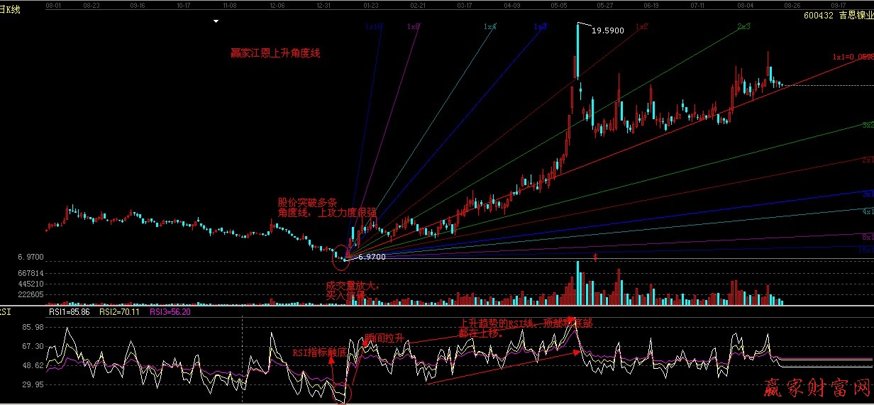 上例中股价经过最后的一波下跌,处于底部,此时RSI指标处于新低。此时我们画出江恩角度线。股价创下新低后,突然接着放量强势拉涨停,RSI指标瞬间回升,股价突破多条江恩角度线的压制,说明此时股价处于强势状态,并将会强势一段时间。此时可以不断地根据RSI指标和江恩角度线结合做低吸高抛的超短线。但是随着时间的推移,股价逐渐震荡上涨突破角度线的压制,RSI指标不断的上升,底部和顶部都在不断的提高,说明股价进入一种长期的上涨趋势。可以做短线,亦可以长期做长线。