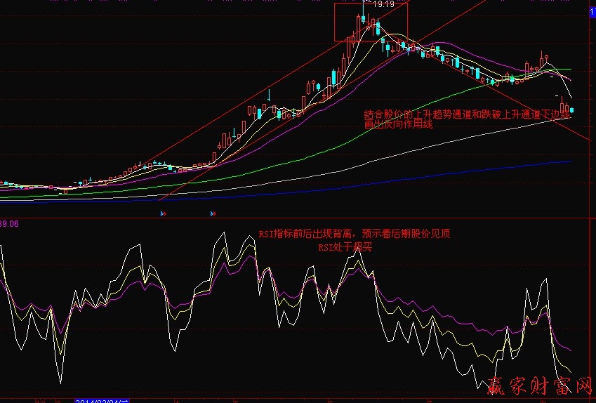 个股在上升趋势通道中不断的上涨,期间RSI指标处于超买状态,但是随着中途的股价小幅调整,RSI出现了快速的回调。股价在上升通道的下边际线得到支撑后开始继续上涨,开始了最后的反攻疯狂的上涨。个股在顶部突破上升通道的上边际线后创下新高。此时RSI指标处于超买的状态,并且前后对比出现了RSI指标的顶背离,说明股价见顶。此时根据反向思维我们画出个股的上涨趋势的反向作用线,也可以称之为股价的下跌趋势线。一旦个股跌破此线就应当获利出局。而股价跌破上升趋势的下边际线为止损线。