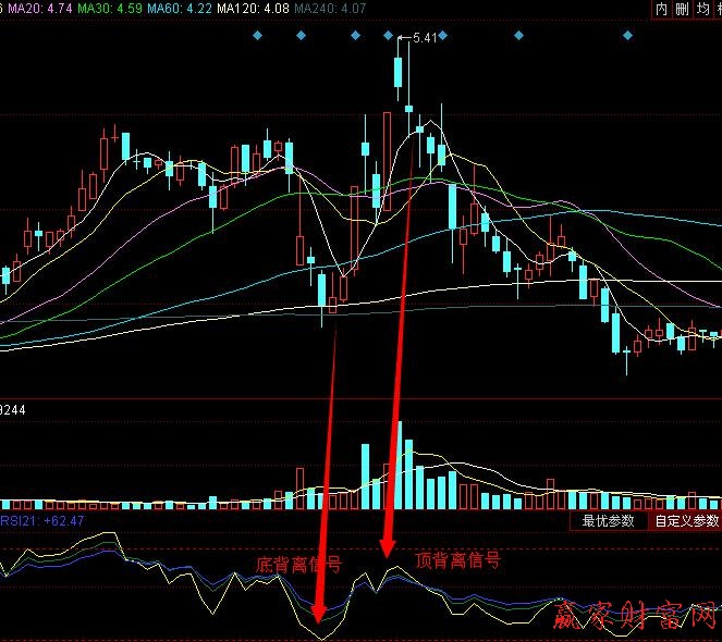 RSI指标的背离是指RSI指标的曲线的走势正好和股价K线图的走势方向正好相反。RSI指标的背离分为顶背离和底背离两种。