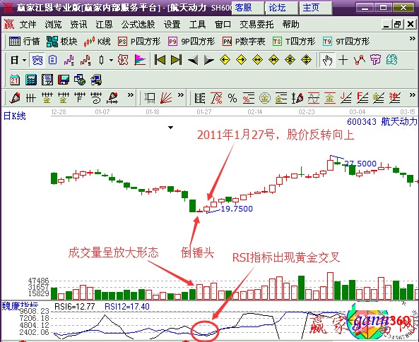 如图2所示,2011年的1月期间,航天动力日K线走势图上出现了RSI指标黄金交叉形态。