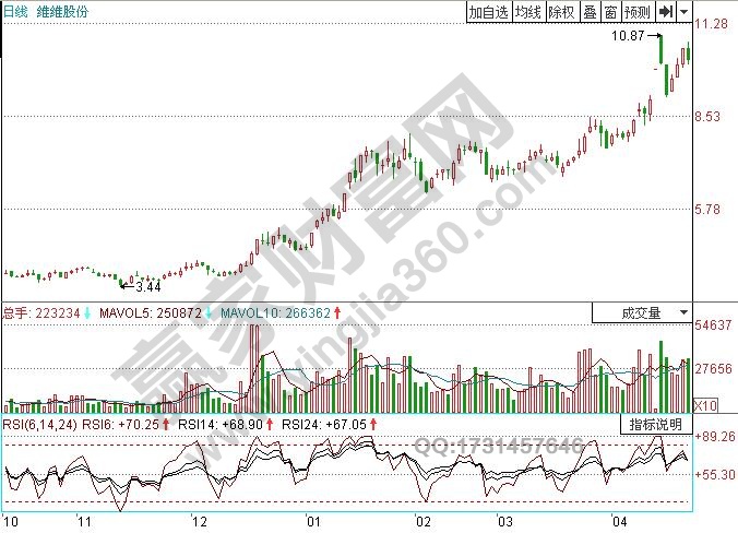 江南化工(002226):股价从高位一路下跌,于2008年10底企稳反弹,出现一波有力的上升行情。RSI也从弱势区向上穿过50强弱分界线到达强势区,在强势区运行一段时间后,于12月12日6日RSI向下死叉12日RSI,在图形上6日RSI在80左右形成三重顶形态。按照常规理论此处应该是个卖点。(文章来自赢家财富网http://www.yingjia360.com)