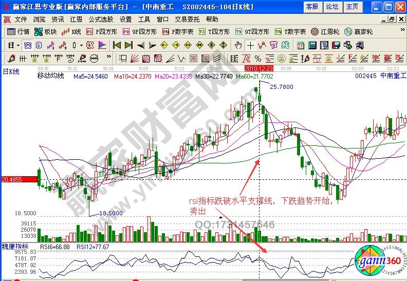 如图该股在2010年12月24日的跳空下跌走势,结合其rsi指标可以看出向下跌破了明显的水平支撑线,是多头的防线,说明此前的多空暂时平衡状态被打破了,空头力量开始压倒多头,后市将会进入下跌趋势中,投资者应该及时的卖出离场,以免后市出现资金损失。