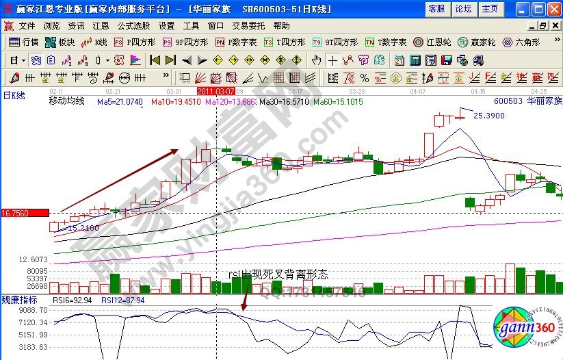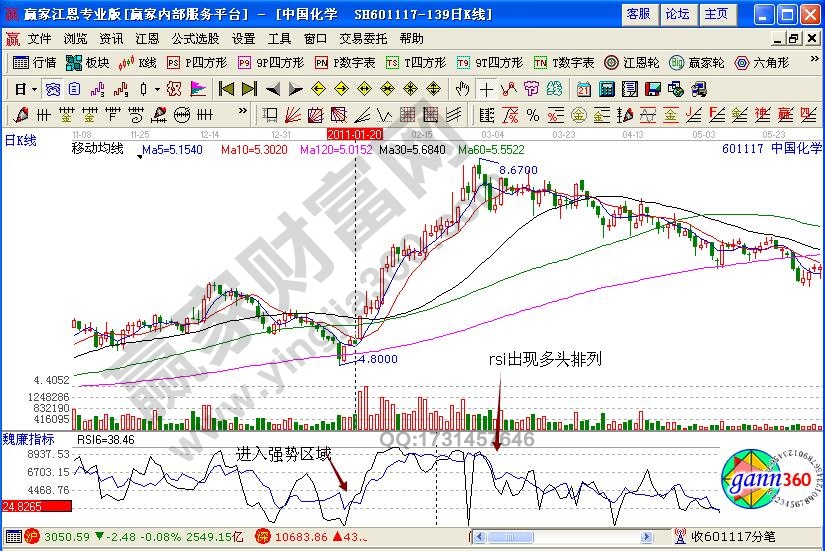 如图该股在2011年1月底到3月初的股价走势变化,在经历了一个月的连续下跌之后,在1月18日的时候形成了V型反转的走势,之后在1月21日涨停,rsi曲线进入到50%以上的区域,表明下跌趋势得到扭转,之后保持着上涨的趋势,而且rsi曲线保持多头排列的形态,而且在这一运行中,短线投资者只要在5日均线处介入,都具有不错的短线获利机会。