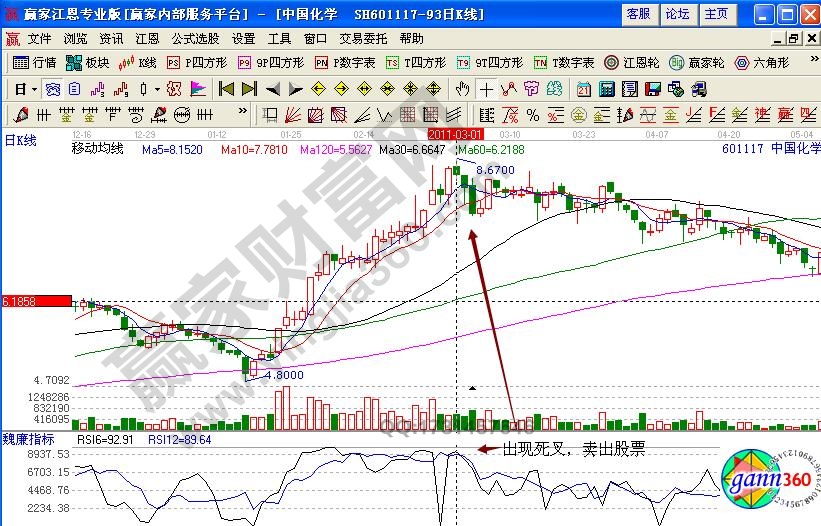 继续观察股价走势变化,可以看出在3月1日的时候,出现了8.67元的高价,之后回落,短期rsi曲线才出现了明显的回落,同时可以看到与中期rsi曲线死叉,这个时候就要果断的卖出股票。