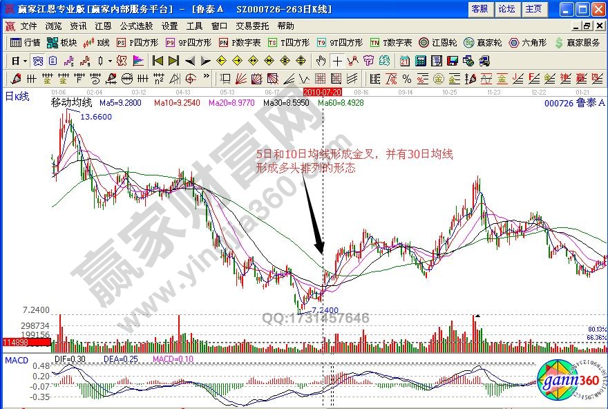 第三种分析方法:当股价经过下跌之后,在低价位的时候突破了5日均线和10日均线的压制,而且5日均线金叉10日均线,之后10日均线和30日均线向上运行,呈现了多头排列的形态,形成了三线金叉的形态,是一种典型的买入信号,预示着后期股价的上涨行情。