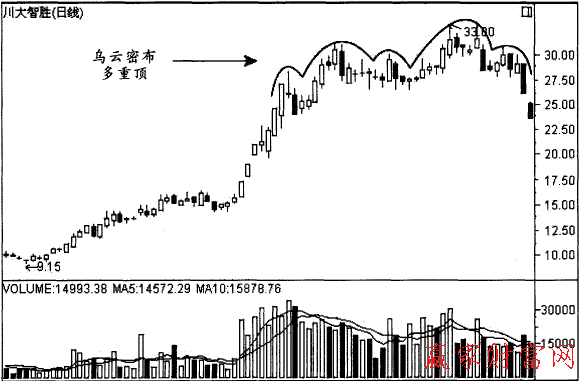 主力控制股价长时间在高位反复震荡盘整,出多进少,一旦主力出完手中的股票,股价则跌破盘整区域,在盘整区域介入的投资者则因股价下跌而被套,我们把这种K线形态称为多重顶。多重顶的形成原理是股价由底部开始上涨,经过主力资金大幅拉升后,股价到了主力的目标位,主力如果用急速下跌的方式出货,则出不了多少,并且价位卖的低,利润大幅缩水。索性就让股价反复上涨下跌,吸引短线客跟进,让散户摸不清方向,主力为了卖个好价钱,极力稳住股价不大幅下跌,这样呼长时间在高位震荡,主力手中的筹码越来越少大部分筹码都被散户接走了,股价随时面临下跌的风险。